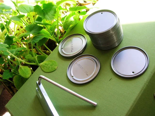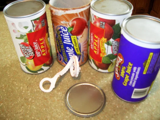 Step one: Collect, wash, and store lids from containers of juice concentrate.