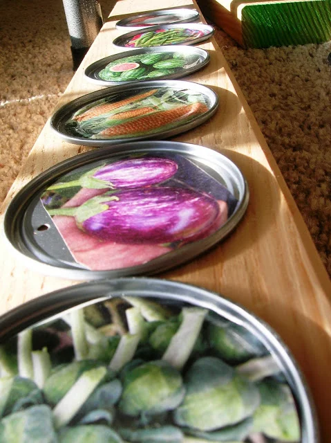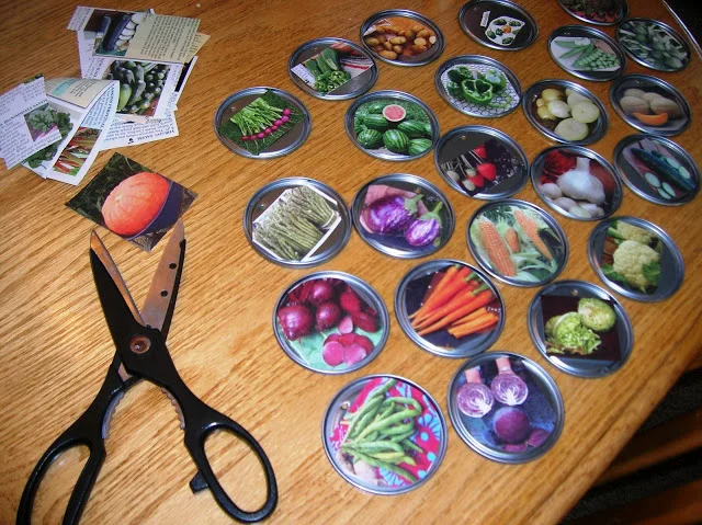 Step three: Cut images from seed catalogs to match the varieties of your seedlings. Cut them to fit within each juice lid, rim-side up. You could also have your kids draw/color pictures instead.