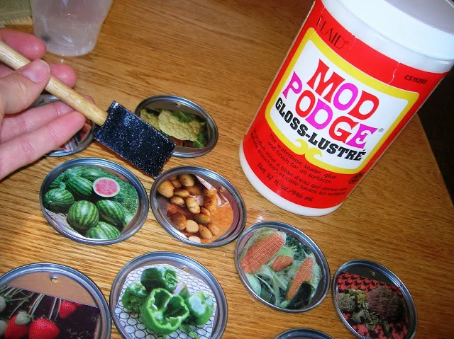 Step four: Using a foam brush, glue each image to the juice lid (you can use mod podge). Spread a layer of mod podge over the picture as well to give it a glossy sheen and protect it from the weather when it’s moved outdoors.