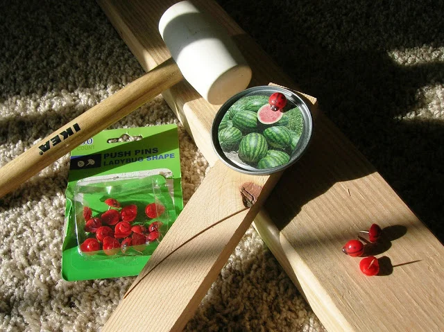 Step seven: Using tiny nails or push pins (e.g. lady bug push pins) attach each juice lid to the top of each post. Rubber mallets work best for push pins, but if you are using nails a hammer is better.